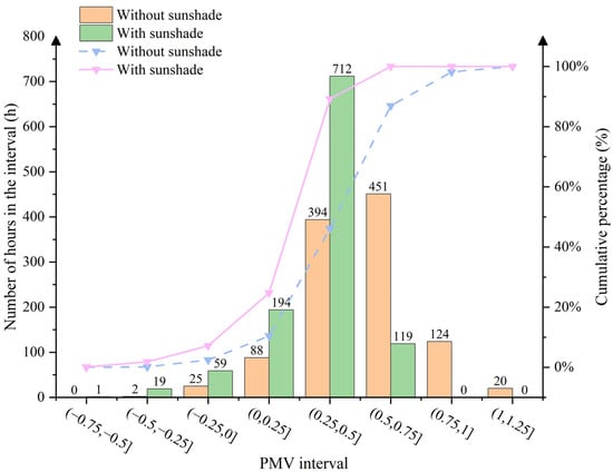 Figure 8 illustrate the PMV data distributions under the two different conditions, as calculated using the CBE tool. To analyze the distribution characteristics of the PMV more intuitively, the data were grouped based on the PMV fluctuation intervals (at 0.25 intervals). The histogram is used to represent the number of hours within each interval, while the line graph depicts the cumulative proportion of hourly occurrences.