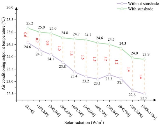 Regardless of whether shading measures are implemented, increased solar radiation leads to a decrease in the air conditioning temperature, emphasizing the critical role of solar heat gain in temperature regulation. A negative correlation between the solar radiation levels and the temperature settings was observed in both the shaded and non-shaded scenarios. In the lower radiation range ([0–400] W/m2), the air conditioning temperature decreases more rapidly. Shading measures effectively reduce the cooling demand, demonstrating that the combination of shading and dynamic temperature adjustment achieves a better balance between energy efficiency and thermal comfort.