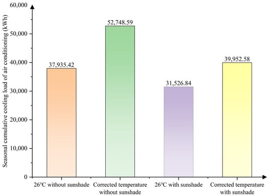 Building energy consumption is significantly influenced by solar radiation, with solar heat gain notably impacting air conditioning energy use []. This effect is particularly pronounced in glass curtain wall buildings, where solar radiation directly penetrates the interior, increasing the cooling load demand. To investigate the impact of solar heat gain on air conditioning energy consumption, this study conducts simulation analyses under different temperature control strategies, including a fixed temperature setting 26 °C and an adjusted temperature setting, as well as combinations of conditions with and without curtain shading. Figure 10 illustrates the seasonal cumulative cooling load of the air conditioning system under these varying conditions.
