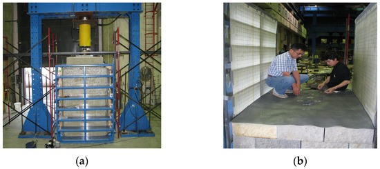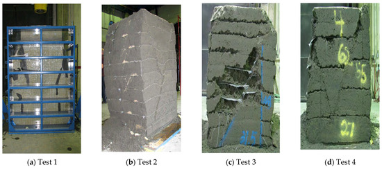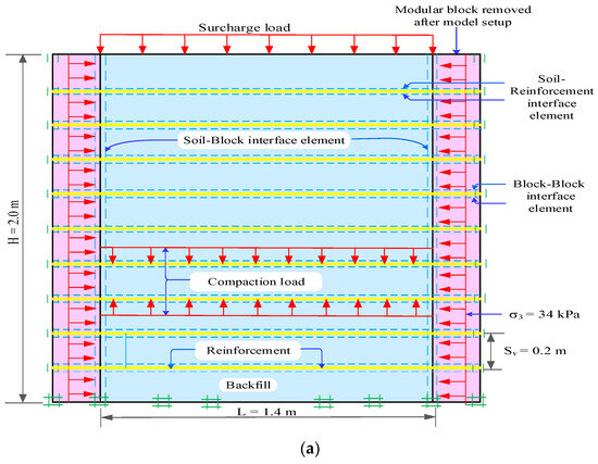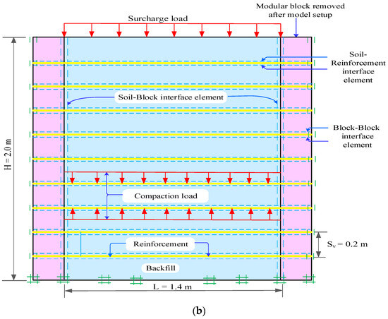 A uniformly distributed surcharge load was applied to the top of the model to simulate operational loading conditions. Reinforcement layers were installed at regular vertical spacings (denoted as Sv). After the model setup was completed, the outermost modular blocks were removed from the simulation to reflect the actual experimental configuration shown in Figure 7, in which these blocks were not retained in the final working structure.