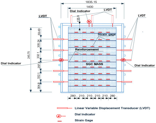 A hydraulic jack with a capacity of one million pounds applied vertical loads to a 30 cm thick concrete pad placed on top of the specimen. To monitor the performance of the SGC mass, LVDTs and digital dial indicators were installed on the concrete pad and along the specimen’s height to measure its vertical and lateral movements, respectively. Additionally, high-elongation strain gauges were used to assess strain within the geotextile reinforcement (refer to Figure 4). Internal soil movements at specific points under failure load were recorded by marking preselected locations on a 2-inch by 2-inch grid system drawn on the membrane (see Figure 5).