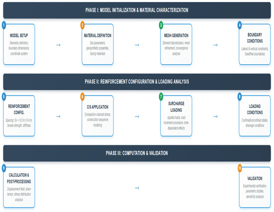 Figure 6 illustrates the structured finite element modeling (FEM) framework employed in this study to simulate the behavior of geosynthetic-reinforced soil (GRS) structures. The modeling process was systematically divided into three main phases: (i) model initialization and material characterization, (ii) reinforcement configuration and loading analysis, and (iii) computation and validation. Each step—from mesh generation and boundary condition assignment to the application of compaction-induced stress and model verification—was implemented to ensure numerical consistency, physical realism, and computational accuracy.