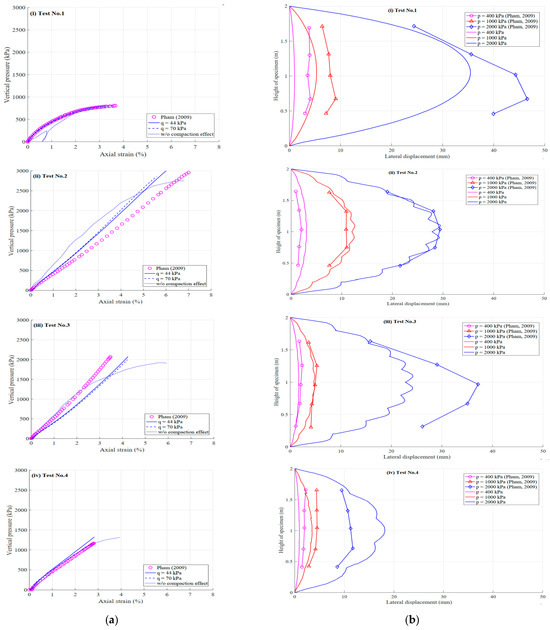 The global stress–strain relationships, lateral displacement at the open facing, and failure patterns from FE analyses compared with measured data by Pham [3] are shown in Figure 8a,b. The simulation results agreed well with experimental data, especially up to 770 kPa (Test 1), 2700 kPa (Test 2), 1900 kPa (Test 3), and 1300 kPa (Test 4).