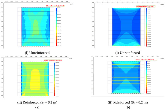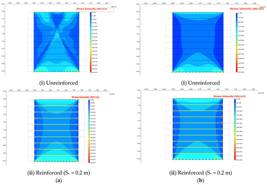 The results showed that vertical stresses within the reinforced soil mass were nearly identical in both the reinforced soil mass and the unreinforced soil mass. This is because vertical load was primarily transmitted through the soil skeleton, with reinforcement affecting lateral restraint rather than vertical load paths. However, the closer-spaced reinforcement layers led to smaller vertical stress in the reinforced soil mass when comparing the different reinforcement spacing of Sv of 0.2 m for both cases, confining pressure and unconfined pressure conditions. The greater number of reinforcement layers enhanced the positive arching effect within the soil mass (Figure 10a and Figure 11a). Arching occurs when load is redistributed around stiff inclusions (reinforcements), reducing vertical stress between reinforcement layers.