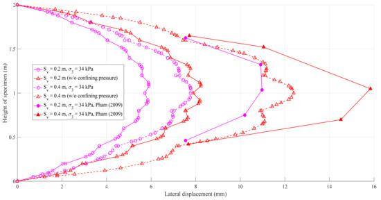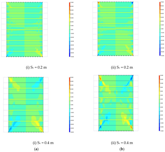 Figure 12 and Figure 14 also show that the higher shear stress was easily observed for the specimen with reinforcement spacing of Sv = 0.4 m compared with the reinforcement spacing Sv of 0.2 m, due to the larger lateral displacement at the open facing of SGC mass. This coincides with the higher axial strain in the model with reinforcement spacing Sv = 0.4 m compared with the model with Sv = 0.2 m (see Figure 13).