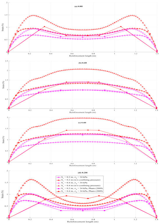 Tensile forces along the length of reinforcement represent the strain distribution along with the reinforcement at 20, 40, 60, and 80% of the specimen height, as measured from the bottom of the specimen, under the applied load of 600 kPa for both confining and unconfined pressure conditions (see Figure 13). The magnitude of maximum strain increased with an increase in reinforcement spacing. Overall, reducing the reinforcement spacing from 0.4 m to 0.2 m significantly improved performance by reducing axial strain in the reinforcement. At the critical location of 0.2 H, the axial strain decreased by approximately 28% under confining pressure and 37% under unconfined pressure. When averaged across all measured locations (from 0.2 H to 0.8 H), the axial strain reductions remained consistent at around 28% and 37% under confining and unconfined conditions, respectively (see Table 3). Furthermore, the numerical results showed good agreement with the experimental data reported by Pham [3]. The maximum reinforcement strain envelope was located very close to the open face of about 0.2 m from the open face at 0.2 H and 0.8 H and moved to about 0.7 m away from the open face at 0.4 H and 0.6 H. The location of peak tensile force in both confining pressure and unconfined pressure was almost identical.