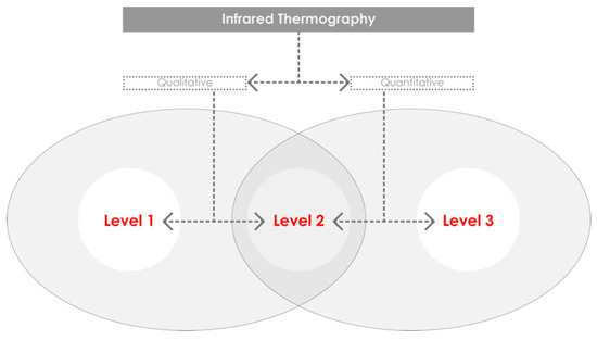 There are several NDT methods that are used in building energy audits, including co-heating tests, heat flux measurement, airtightness testing, automated meter reading, and computational simulations. As an NDT method, IRT can be used in building energy audits at different levels, as shown in Figure 1 [41]. Qualitative IRT is based on potential thermal anomaly identification, while quantitative IRT is characterized by numerical analysis to quantify the rate of heat transfer (e.g., thermal transmittance (U-value) determination) [42]. While both of these methods are applicable in level 2 audits, it is rare to find their simultaneous implementation. For level 3 audits, hourly energy simulation is required to help auditors to make informed decisions about building improvements. For an existing building, comparing the real U-values of walls and windows with the design values is essential. However, the literature does not comprehensively explore uncertainty due to changes in the building envelope’s U-value due to environmental conditions, material degradation, and deterioration [43].