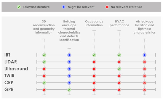 Figure 3 shows a matrix of the relationships between the different building envelope scanning techniques and various building energy model inputs. While IRT may provide more benefits compared to other techniques, it cannot provide all the required information. IRT might be useful in extracting information regarding leakage locations through the building envelope. Still, none of these techniques can be used to characterize the airtightness level of the whole building or enclosure in an accurate way. Other tools (e.g., blower door test) might be used in a hybrid workflow to fully characterize the thermal and airtightness properties. While IRT approaches might not be efficient for subsurface component identification, building energy simulation requires detailed thermal and visual surface and subsurface properties (e.g., thickness, thermal conductivity, and solar absorptance information for each layer).
