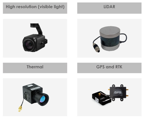 Examples of sensors, including high-resolution (visible light), LiDAR, thermal, GPS, and RTK sensors. Adapted with permission from [58].