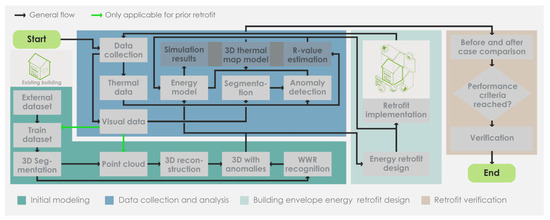 Considering the findings of the review regarding the potential of a drone-based approach, this study developed a drone-based framework for integrated building envelope assessment, which automates building envelope inspection procedures and collects data for the development of semantic-rich BIMs and energy models for retrofit design. Figure 8 shows an overview of the proposed workflow for drone-based building inspection, with four components: initial modeling; data collection and analysis; building energy retrofit design and implementation; and retrofit verification.