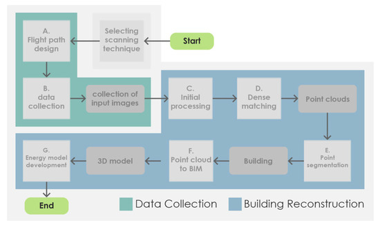 The reviewed literature varies some parameters in the recommended building inspection methodologies. Based on the proposed comprehensive workflow outlined in Figure 8, a case study was developed to demonstrate its application within a focused area. This case study specifically targets building reconstruction and the reproduction of geometries for use in building energy modeling. It follows the full workflow shown in Figure 8, including data collection, point cloud generation, classification, and digital model generation and conversion for energy simulation. Figure 9 presents a simplified version of this workflow. The main objective of the case study was to design and test an empirical setup for drone-based building inspection using thermal and RGB imagery.
