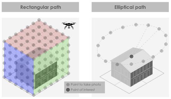 Several researchers have addressed the issue of flight planning through mathematical modeling, considering the limitations of camera technology and battery life to develop equations that consider the drone’s distance from the target, the flight speed, and the path geometry [81]. A research study utilized mathematical principles to optimize drone flight paths and a scientific process to test the feasibility of auditing a geo-cluster of 300 buildings with a quadrotor [82]. Their findings demonstrated that, with the developed algorithms, the quadrotor could scan a cluster of 300 buildings in approximately 6 h, assuming unlimited battery life, although this hypothesis has only been tested on significantly smaller scales. While mathematical principles help to optimize drone-based auditing, various researchers have decided to tackle the issue of flight paths using a more geometric approach [40], and the most common solution has been to design either vertical, horizontal, or elliptical flight paths.