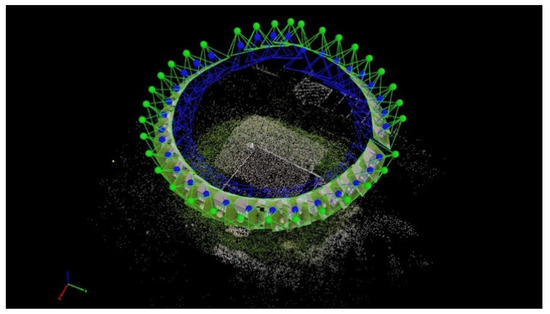 The elliptical flight was investigated for the creation of a 3D point cloud of the building, in addition to the actual camera path over the tie points. A rectangular flight path was designed and implemented as well, as this is more useful for an automated vision-based envelope inspection. In the rectangular flight path shown in Figure 10, two representative vertical flight paths and one horizontal flight path are highlighted in color (northern vertical plane in blue, western plane in green, and horizontal plane in red). However, in the experiment, all five different envelope planes were inspected. The Pix4Dcapture (which provides free flight capabilities to follow vertical flight plans and grid capabilities for automated horizontal flight paths) and DJI Pilot apps were used to control the drone (taking images that were perpendicular to the façade) during the flight. Distances of 3.5 m from the finishing of the vertical faces of the building envelope and 7.5 m from the top point of the roof, with a 3 m step to capture images, were considered in the flight path design step. These considerations allowed us to obtain higher image overlap than when using the threshold range of 70–80% that was discussed before.