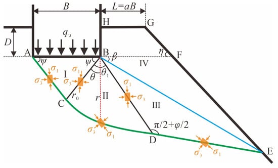 A strip foundation with a width B and an embedment depth D is positioned adjacent to a slope inclined at an angle η, as illustrated in Figure 1. The horizontal distance from the foundation to the slope crest is L = aB, where coefficient a is defined as the ratio of the horizontal distance L to the foundation width B. When the foundation soil reaches the ultimate bearing capacity qu, the foundation undergoes general shear failure. The corresponding failure mode is shown in Figure 1. The soil along the sliding surface is assumed to be in a state of plastic limit equilibrium, and its shear strength satisfies the Mohr–Coulomb failure criterion. The failure mode is divided into four zones, with the following assumptions: