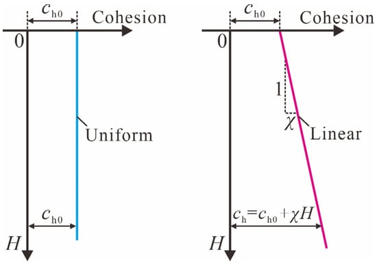 This study solely considers the heterogeneity and anisotropy of cohesion for single-layer soil. When the foundation soil is homogeneous, cohesion is uniformly distributed with depth. In contrast, cohesion typically varies with depth for heterogeneous soils. A typical pattern of cohesion distribution is a linear increase along the depth [14,24,25], as depicted in Figure 2. In this figure, ch0 represents the cohesion in the horizontal direction of the shear plane at the top of a slope, and χ denotes the gradient of the linear increase in cohesion with depth. A dimensionless coefficient ν = χB/ch0 is defined as the heterogeneity coefficient to quantify the soil heterogeneity effect on the ultimate bearing capacity of foundations adjacent to slopes. Accordingly, the horizontal cohesion at a depth H can be expressed as