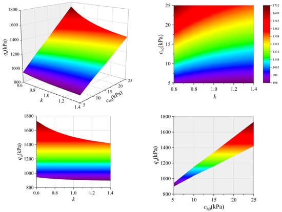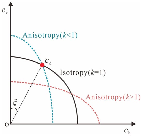 where cv is the vertical cohesion. The anisotropy coefficient is defined as k = cv/ch, representing the ratio of vertical to horizontal cohesion. For specific soil at a given site, the coefficient k can be approximated as a constant, and it typically ranges between 0.5 and 1.33 [26]. The cohesion is isotropic with k = 1, while k typically exceeds 1 for over consolidated soils [7,26]. Substituting k = cv/ch into Equation (3) yields