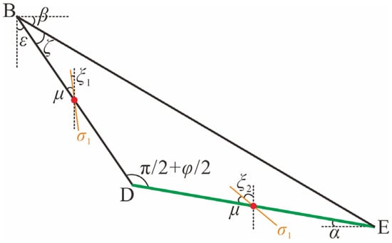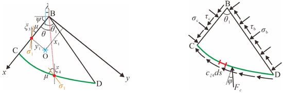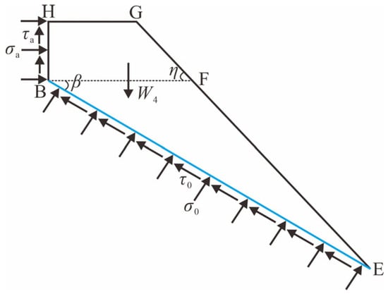 Zone IV (BEGH) is taken as an isolator, and its force analysis is illustrated in Figure 4. The static force equilibrium in the normal and tangential directions along surface BE can be expressed as