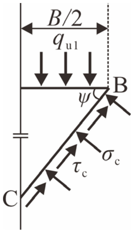 In Figure 7b, σc and τc are the normal and shear stresses on surface BC, respectively. The resistance due to cohesion on the differential length ds acting on surface CD is cξ4ds. Fc is the resultant radial force on surface CD caused by cohesion and surcharge. The direction of Fc forms an angle φ with the normal of surface CD and points towards point B. The moment equilibrium at point B can be expressed as