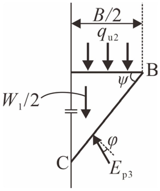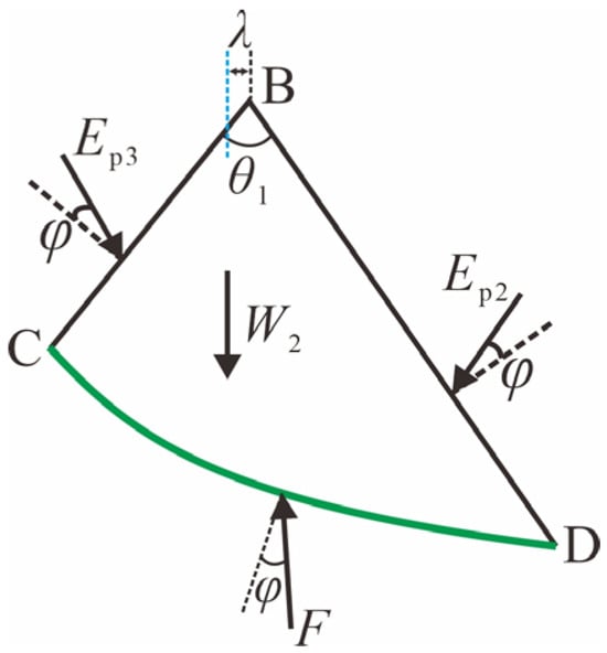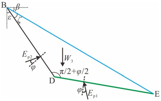 The geometric parameters and force analysis of isolation BCD (Zone II) are illustrated in Figure 7. Similar to the analysis process for isolator BDE, the depth H3 at the midpoint of BC in Figure 7a is