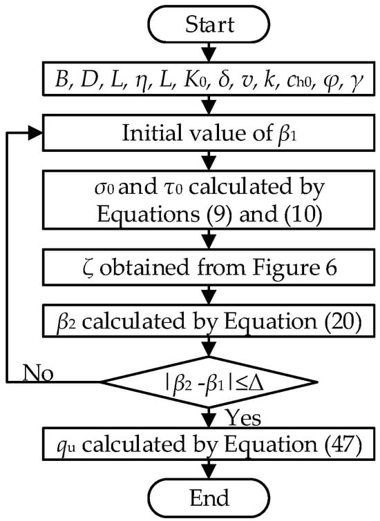 The angle β is determined by an iterative trial method as follows: (1) An initial value of β1 is assumed, and the equivalent stresses (σ0 and τ0) are calculated by Equations (9) and (10); (2) The angle ζ is determined from the geometric relationship shown in Figure 6; (3) An updated β2 is calculated by substituting ζ into Equation (20); (4) The iteration continues until the difference between β2 and β1 meets the convergence criterion Δ. For instance, an initial value of β1 can be defined as φ/2 with an error tolerance value of Δ = 0.01°. Typically, satisfactory calculation results can be obtained within no more than five iterations. Throughout this process, the values of ζ, θ1, σ0 and τ0 are obtained and subsequently substituted into Equation (47) to determine the ultimate bearing capacity of foundations adjacent to heterogeneous and anisotropic slopes. A detailed flowchart of the calculation steps is provided in Figure 12.
