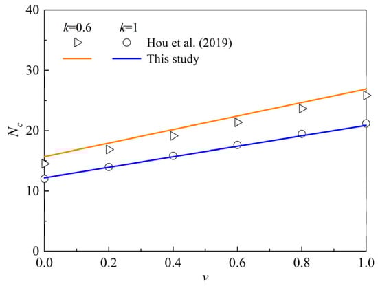 Figure 13 demonstrates that results of Nc from Equation (36) in this study and Hou et al. [17] display a consistent increasing trend with the heterogeneity coefficient ν. The calculated results of Nc from both studies are relatively close with mean relative errors of merely 5.5% for k = 0.6 and 1.2% for k = 1. Therefore, the accuracy of Equation (36) in this study is verified, which in turn validates the reliability of Equation (47) for the ultimate bearing capacity of foundations adjacent to slopes. Notably, the results of Nc for k = 0.6 are significantly higher than those for k = 1 (corresponding to isotropic soil), indicating that a decrease in the anisotropy coefficient is beneficial for the stability of foundations adjacent to slopes.