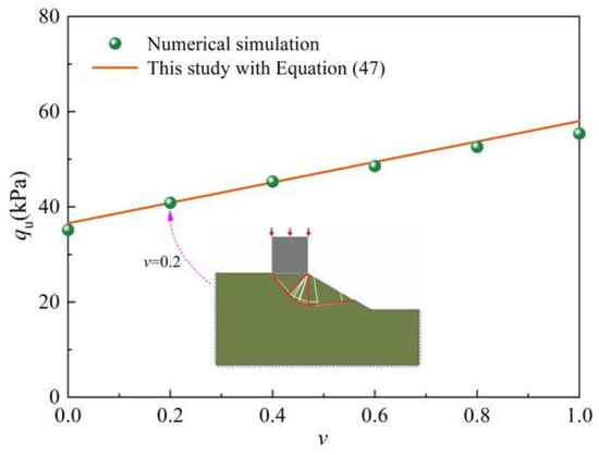 Table 1 reveals that the ultimate bearing capacity qu obtained from this study and Jin et al. [14] exhibits a remarkable increase with the augmentation of the heterogeneity coefficient ν. For the slope angle of η = 10°, 20° and 30°, the mean relative errors (MRE) are only 4.0%, 5.1% and 7.5%, respectively. These results indicate a strong agreement between the two studies; thereby, the accuracy of the proposed Equation (47) is validated. Furthermore, the ultimate bearing capacity qu decreases with an increasing slope angle. This reduction in bearing capacity demonstrates that slope angle constitutes a critical impact on foundation stability.