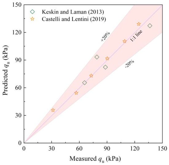 Several reduced-scale model experiments have been conducted to investigate the ultimate bearing capacity of strip foundations on slopes [28,29]. Due to the use of the layered paving method in preparing foundation model specimens, with the compaction process being identical for each soil layer, the foundation soil can be considered uniform and isotropic. Figure 15 compares the predicted value from this study (ν = 0 and k = 1) with the model experimental results. The calculation parameters are based on experimental parameters from the literature. Furthermore, the experiments were conducted under conditions of a smooth base, and calculations in this study were based on a completely smooth base scenario. The 1:1 line in Figure 15 represents perfect alignment between the predicted and measured values. This comparison underscores the validity of the computational formula proposed in this study, as the error between the measured values from two sets of model experiments and the predicted values in this study does not exceed 20%.