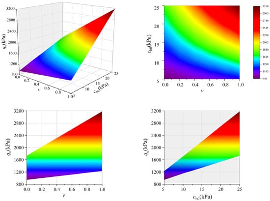 The variation in the heterogeneity coefficient ν is employed to analyze the impact of soil heterogeneity on the ultimate bearing capacity qu of foundations adjacent to slopes. Figure 16 reveals the variation in the bearing capacity qu with respect to ν and ch0. Here, the anisotropy coefficient k = 0.6. Results show that the ultimate bearing capacity qu significantly increases with the rise in the heterogeneity coefficient ν. An increase in cohesion significantly enhances the bearing capacity qu. Specifically, as the coefficient ν increases from 0 to 1 with ch0 = 10 and 20 kPa, the bearing capacity qu increases by 48.6% and 75.6%, respectively. This trend can be attributed to the progressive increase in soil cohesion as the coefficient ν rises, which markedly improves the ultimate bearing capacity, especially for higher cohesion. Therefore, cohesion heterogeneity is crucial in determining the ultimate bearing capacity of foundations adjacent to slopes. Neglecting soil heterogeneity results in a conservative underestimation of the ultimate bearing capacity and fails to fully develop the actual strength of foundation soils.