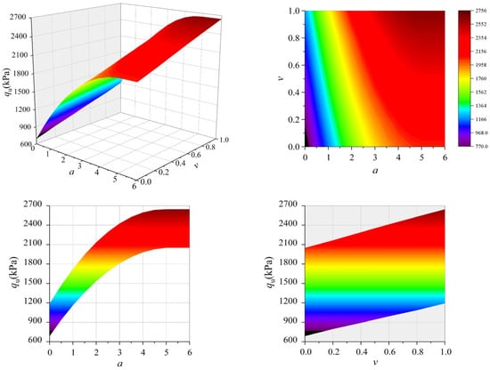 The horizontal distance from foundation to slope crest is denoted as L = aB, where the dimensionless coefficient a characterizes its influence on the ultimate bearing capacity of foundations adjacent to slopes. Figure 18 presents the variation in the ultimate bearing capacity qu with coefficient a and ν for k = 0.6. It can be seen from Figure 18 that as the coefficient a increases, the ultimate bearing capacity qu nonlinearly increases. However, its growth rate decreases gradually, and the final bearing capacity converges to a stable value. In the case of a completely rough base, for instance, as the foundation moves from the slope crest (a = 0) to a = 5, the ultimate bearing capacity qu increases by 1.98, 1.50 and 1.22 times for coefficients ν = 0, 0.5 and 1, respectively. The rate of increase in bearing capacity qu decreases gradually with increasing a, and qu converges to a stable value at the critical distance coefficient ac = 5. Beyond this point (a ≥ 5), the bearing capacity qu equals that of foundations on the level ground. The extent of the sliding zone beneath strip foundations increases with an increasing distance to the slope crest. Hence, the strength of foundations adjacent to slopes improves as the foundation is positioned farther from the slope crest, and this effect becomes more marked with a higher value of the heterogeneity coefficient.