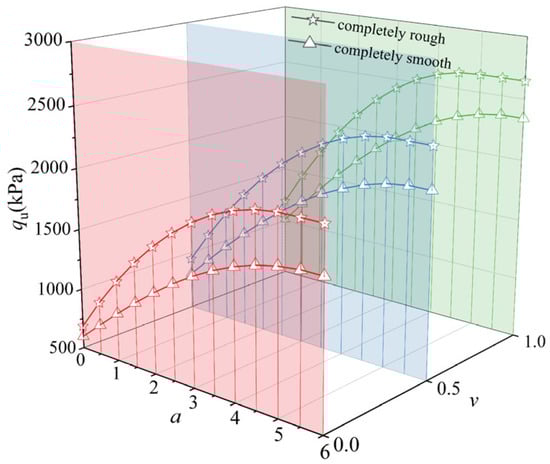 The base roughness directly affects the angle ψ between faces AB and BC. Two extreme base roughness conditions are discussed: a completely rough base with ψ = φ and a completely smooth base with ψ = π/4 + φ/2. When the heterogeneity coefficient ν is 0, 0.5 and 1, the ultimate bearing capacity qu varies with the coefficient a as shown in Figure 19. It is found that the bearing capacity qu is greater for a completely rough base than for a completely smooth base. For the coefficient ν = 0, 0.5 and 1 with a = 1, the bearing capacity qu for a completely rough base compared to that for a completely smooth base is increased by 29.7%, 25.1% and 24.4%, respectively. These findings highlight that base roughness significantly affects the ultimate bearing capacity estimation for foundations adjacent to slopes, with its effect being more pronounced at a lower heterogeneity coefficient. Notably, the critical distance coefficient ac is larger for a completely smooth base than for a completely rough one, which indicates a slower convergence of the ultimate bearing capacity for smooth bases.