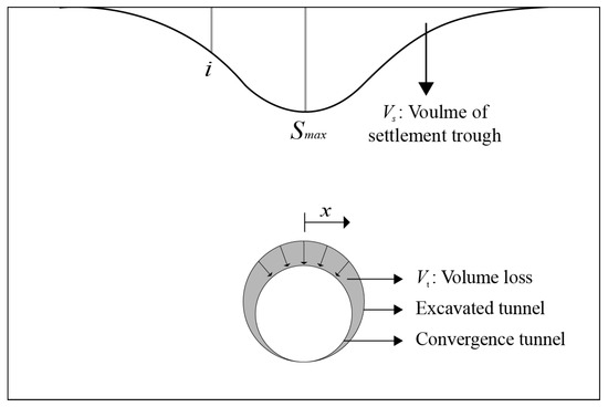 Peck [8] proposed, based on empirical observations, that the settlement profile at the ground surface due to tunneling can be approximated by a Gaussian function. Assuming undrained conditions and incompressible soil behavior, the point at which the settlement trough reaches its maximum should be located directly above the tunnel centerline. The settlement Sv(x) can be calculated by using Equation (1), and the corresponding settlement trough is shown in Figure 2.