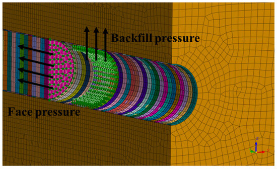 The face pressure was simulated by applying stress directly to the tunnel face. Although face pressure generally varies with depth in Shield TBM construction, it was assumed to be uniformly distributed in this study. During excavation, the applied face pressure was removed. Subsequently, as the shield advanced, the face pressure was reapplied to the newly exposed tunnel face. Following this, backfill pressure was simulated at the tail void to reflect the pressure exerted after the installation of the segment and the injection of grout. This step was included to model the support mechanism acting behind the shield during tunnel advancement. Figure 5 shows the face pressure and the backfill pressure simulation.