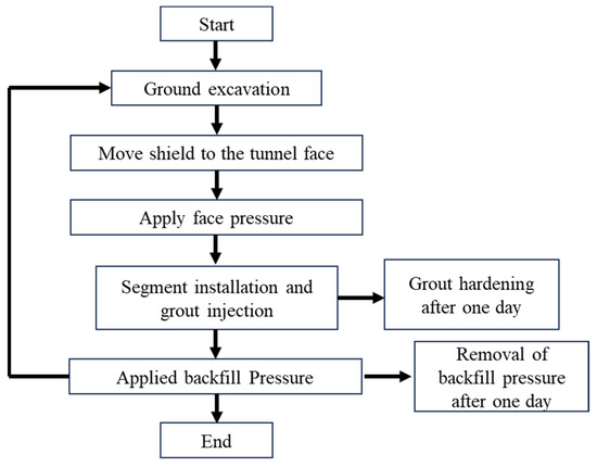 The sequential process of Shield TBM tunneling simulated in this study is illustrated in Figure 6. The sequence begins with tunnel excavation, followed by shield advancement. Once the shield has progressed, face pressure is applied to the newly exposed tunnel face. Subsequently, lining segments are installed, and grout is injected into the tail void. Backfill pressure is then applied, and this entire cycle is repeated iteratively. Grouting was modeled using the simultaneous injection method. The elastic modulus of the grout was updated daily to simulate time-dependent curing behavior. Since more than 80% of the total strength develops within the first day, backfill pressure was applied for only one day. Each segment ring measures 1.5 m in length, and the daily excavation rate was assumed to be five rings (7.5 m) for the numerical analysis.