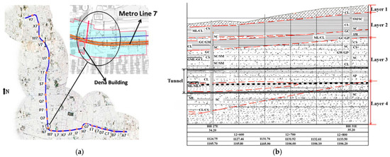 Tehran Metro Line 7: (a) Main route and the analyzed section [18]; (b) geological profile of the analyzed section, reported by Zaminfanavaran Consulting Engineers (ZAFA, 2007) as cited in Chakeri et al. [18].