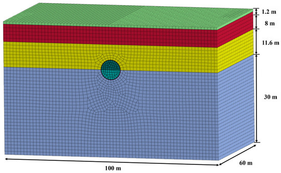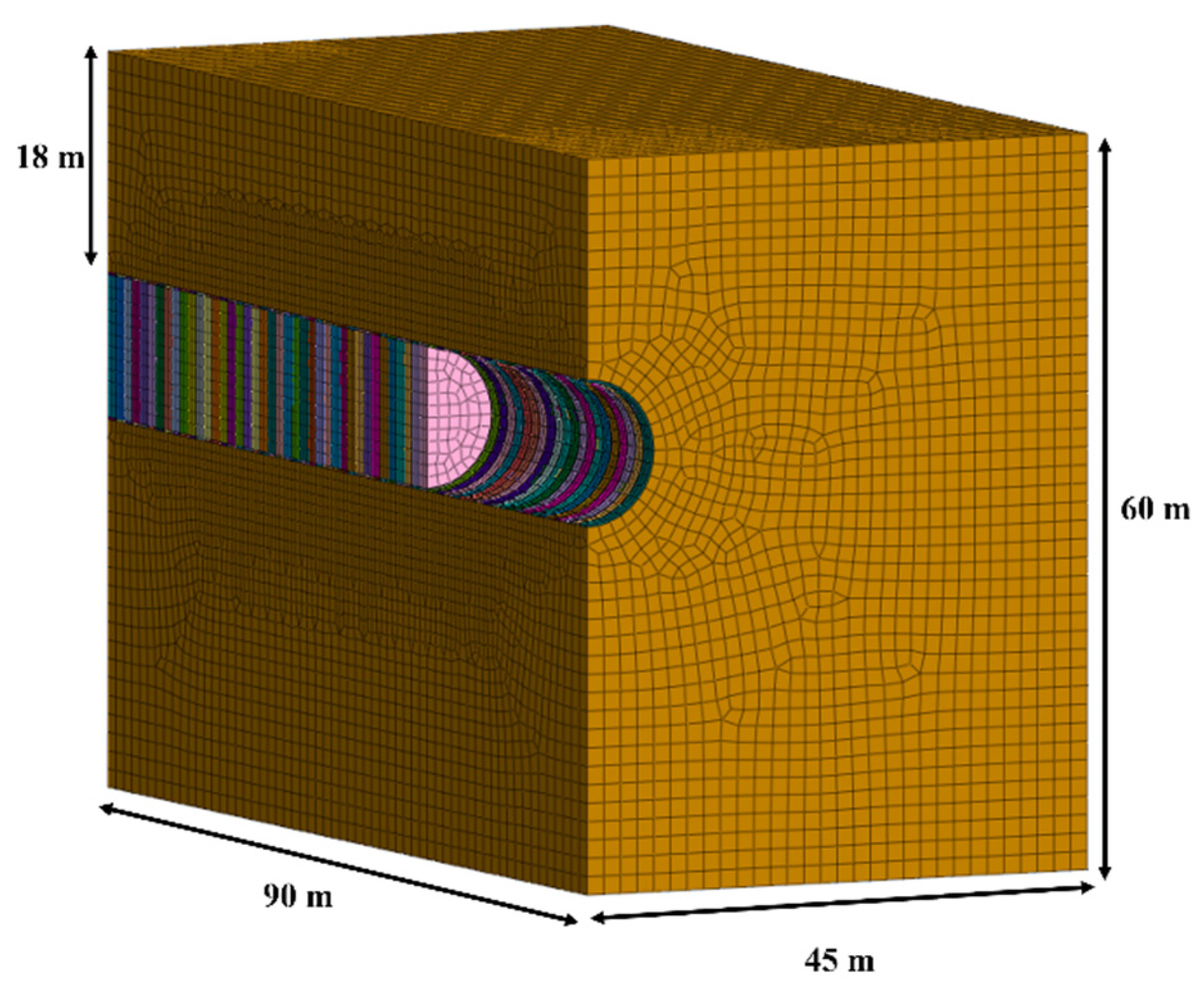 In this study, numerical analyses were conducted using Midas GTS NX 2024 v1.1, a finite element method (FEM) software. Accurate simulation of Shield TBM tunneling depends heavily on the appropriate selection of domain size. Tunnel excavation redistributes stress in the surrounding ground, influencing regions beyond the immediate tunnel boundary. Since ground settlement primarily occurs above and around the tunnel, the simulation domain must be large enough to reflect these effects. Based on prior research, the domain in this study was set to at least three to four times the tunnel diameter to ensure reliable results [35,36].