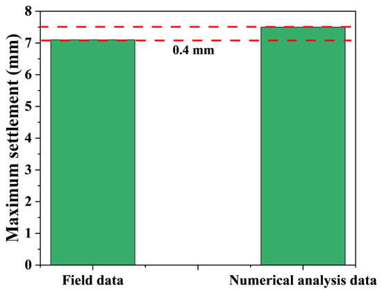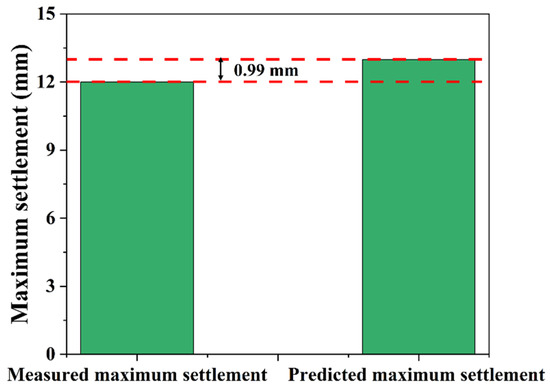 The field measurement indicated a maximum settlement of approximately 12 mm, while the predicted value from the proposed model was 12.99 mm (Figure 20). The difference of 0.99 mm corresponds to a deviation of 8.25%, demonstrating a strong agreement between the model prediction and the field observation.