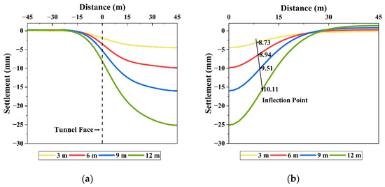Figure 11b shows that the inflection point moves farther from the tunnel centerline as the tunnel diameter increases. This trend aligns with the observations of Chakeri et al. [29] and Sohaei et al. [44], who reported that larger tunnel diameters lead to broader settlement troughs due to outward-shifting inflection points.