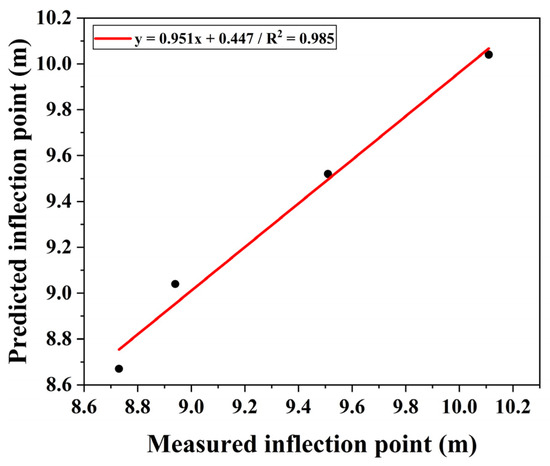Regression analysis was performed to calibrate the modified equation, and the resulting coefficient and exponent were determined to be 0.837 and 1.051, respectively. Based on these values, a new empirical equation for predicting the inflection point in Shield TBM tunneling under weathered rock conditions, with consideration of tunnel diameter, was established as Equation (9). Figure 12 presents a comparison between the inflection points obtained from numerical simulations and those predicted by the regression model. The coefficient of determination (R2) was 0.985, indicating a strong correlation between the predicted and simulated results.