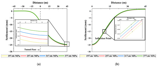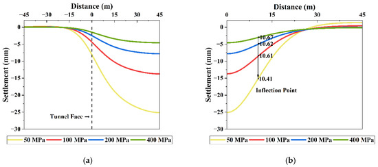 Figure 13 shows the settlement troughs corresponding to different values of ground elastic modulus. As the elastic modulus increased, excavation-induced settlement exhibited a clear decreasing trend. This indicates that greater ground strength reduces the impact of tunneling on surrounding ground behavior. At an elastic modulus of 50 MPa, the maximum settlement was 25.13 mm. As the modulus increased to 400 MPa, the maximum settlement decreased to 4.57 mm, representing a total reduction of 81.82%. These findings are consistent with previous studies, confirming that increased elastic modulus improves ground stiffness and reduces settlement [48,49,50].