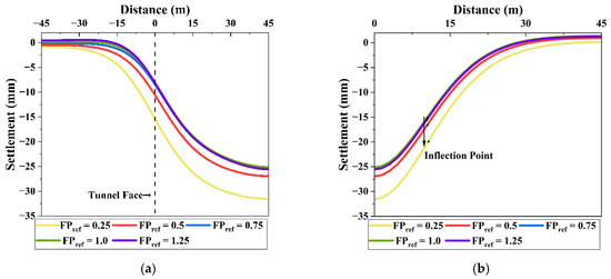 At FPref = 0.25, the maximum settlement was 31.54 mm. As FPref increased to 1.0, the settlement decreased to 25.15 mm, representing a reduction of 20.27%. However, when FPref was further increased to 1.25, the maximum settlement slightly increased to 25.55 mm. This suggests that excessive face pressure may induce additional ground deformation, which is consistent with the findings of Kim et al. [54].