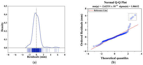 Residual analysis results of the proposed prediction model: (a) kernel density estimation of residuals; (b) normal Q–Q plot of residuals.