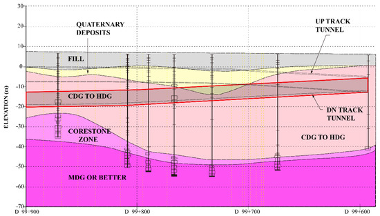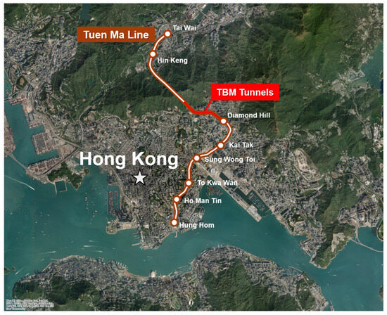 A comparative analysis was conducted using field data from the Hong Kong subway project [59] to evaluate the applicability of the proposed maximum settlement prediction model to Shield TBM tunneling. The data used in this study were obtained from a 1.7 km TBM tunnel section starting at Diamond Hill on the Tuen Ma Line, constructed as part of the Sha Tin to Central Link Project (Figure 18). Figure 19 shows the geological section of the construction site, and Table 10 summarizes the ground properties. The field consists of completely decomposed granite (CDG), a type of weathered granite suitable for model comparison. The Shield TBM used in this project had a diameter of 7.45 m with an overburden depth of 14.68 m. The applied face and backfill pressures were 244 kPa and 400 kPa, respectively.