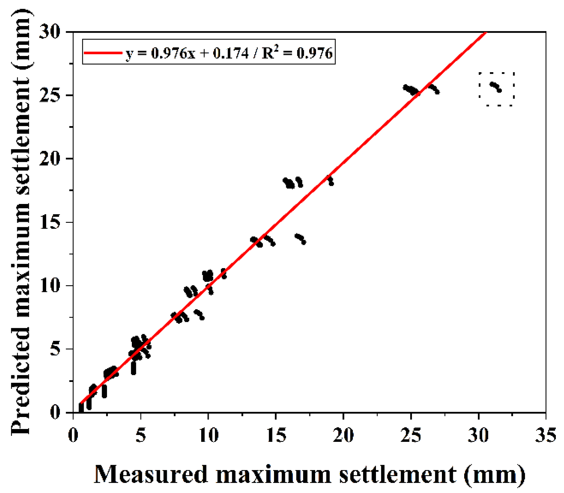 Relationships between measured maximum settlement and predicted maximum settlement.