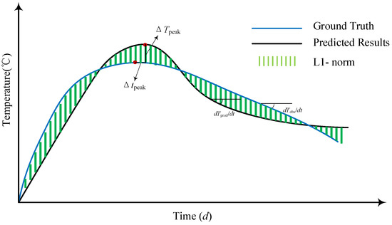 where is the measured temperature time–history curve; is the finite element predicted temperature curve; and t0 and te are the start and end times of the monitoring period, respectively. This function quantifies the degree of matching of the cumulative released energy of hydration heat by integrating the area of the absolute difference between the two curves. It is suitable for evaluating the matching of the global temperature evolution trend.