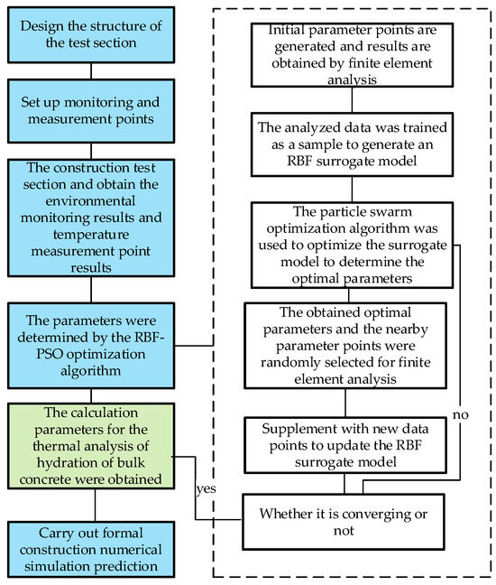 This study proposes a method for inverting the hydration heat parameters of mass concrete by integrating a Radial Basis Function (RBF) surrogate model and a Particle Swarm Optimization (PSO) algorithm. As shown in Figure 1, this method uses experimental temperature monitoring data to drive parameter calibration, establishing a closed-loop inversion system of “field monitoring—numerical simulation—surrogate model—intelligent optimization.” The specific implementation process includes the following four core stages: (1) multi-source data acquisition and finite element modeling; (2) construction of the RBF-PSO hybrid optimization mechanism; (3) parameter inversion driven by a multi-objective function; and (4) calibration parameter verification and engineering application.