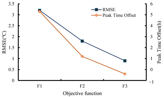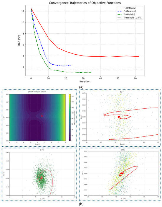 - Hybrid Objective Function Superiority: The hybrid-type F3, integrating Dynamic Time Warping (DTW) and feature penalty terms, demonstrated an optimal performance in balancing global curve morphology and local feature accuracy. It achieved a 74% reduction in the prediction error (MAE = 1.0 °C) compared to F1 and improved parameter identification precision (e.g., <2% error in Q∞), validating its robustness against spatiotemporal uncertainties.