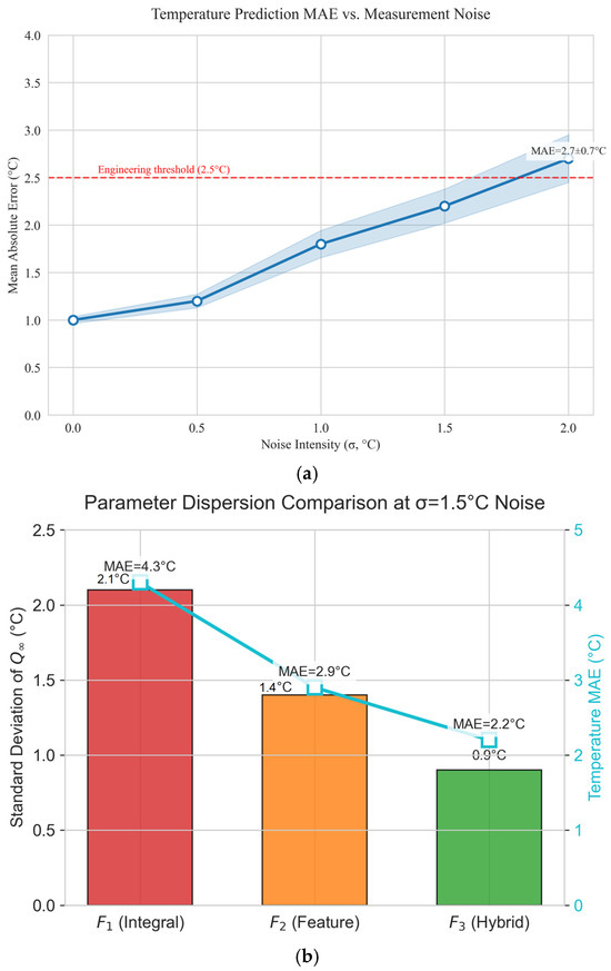 The framework maintains operational reliability up to σ = 2.0 °C noise, covering 95% of field sensors. F3′s structure reduces parameter dispersion by 40–60% versus conventional methods, demonstrating essential robustness for construction-grade monitoring. Future work will integrate online Kalman filtering to further suppress high-frequency noise.