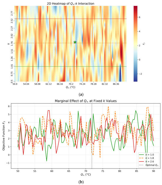 For low k values (k = 0.02 h−1), increasing Q∞ significantly elevates the objective function F3, as a slower heat release (low k) combined with a higher total heat (Q∞) exacerbates temperature overshoots. Conversely, for high k values (k = 0.08 h−1), the impact of Q∞ plateaus due to rapid heat dissipation.
