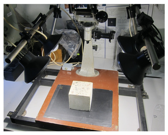 Images of the concrete specimen cross-sections surfaces were recorded with a digital camera NIKON D-7000 (Nikon Corporation, Tokyo, Japan) with a Nikon NIKKOR Z 50 mm f/1.8 lens (Nikon Corporation, Tokyo, Japan) mounted on the developed laboratory setup with the ability to change its height from the specimen surface. Illumination was provided by four identical LED light sources placed on each side of the sample at a low height, which makes it possible to use their combinations to obtain images of sections of concrete test specimens at different angles of light incidence. The scale of the images was 30 μm/pixel, which allowed to obtain clear images on which voids with a size of 90 μm and more can be detected. The images acquisition was carried out in an optical laboratory, which excluded any influence of uncontrolled natural light. The resulting images are suitable for several methods for detecting voids in concrete. A photo of the laboratory setup is shown in Figure 3.