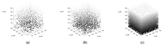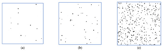 Next, we modelled the voids in a concrete cube based on a uniform distribution for different volume concentrations. This is a limitation, as voids can form clusters or chains. Modelling such void co-location may be the subject of further research. The modelled distribution with different sizes of air voids in concrete cube and air content of 0.25% (a), 0.5% (b), and 5% (c) is demonstrated in Figure 5. By analysing the images of the slices of the modelled cube, it is possible to calculate the air content by cross-sectional area. Ten images of slices of modelled cubes were analysed in this experiment. Cross-sections of a fragment of modelled cube with air content of 0.25% (a), 0.5% (b), and 5% (c) are demonstrated in Figure 6. Results of modelling air voids in concrete are discussed in Section 3.1.